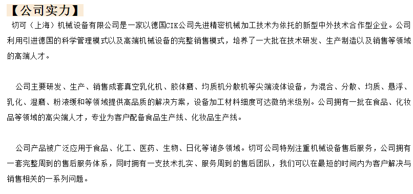 CIK可控温乳化机可以很好的解决,乳化时温度升高的问题,可通冷却水进行冷却;需要高温时又可以通蒸汽或者热水进行升温;保证乳化过程中的温度要求,可以更好的进行乳化,得到高质量的乳化产品。